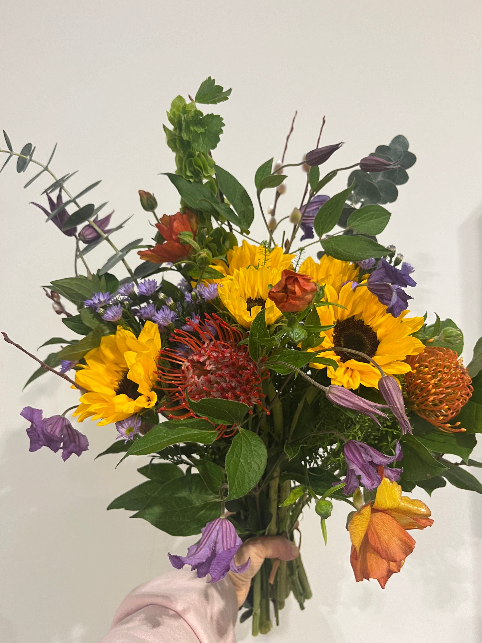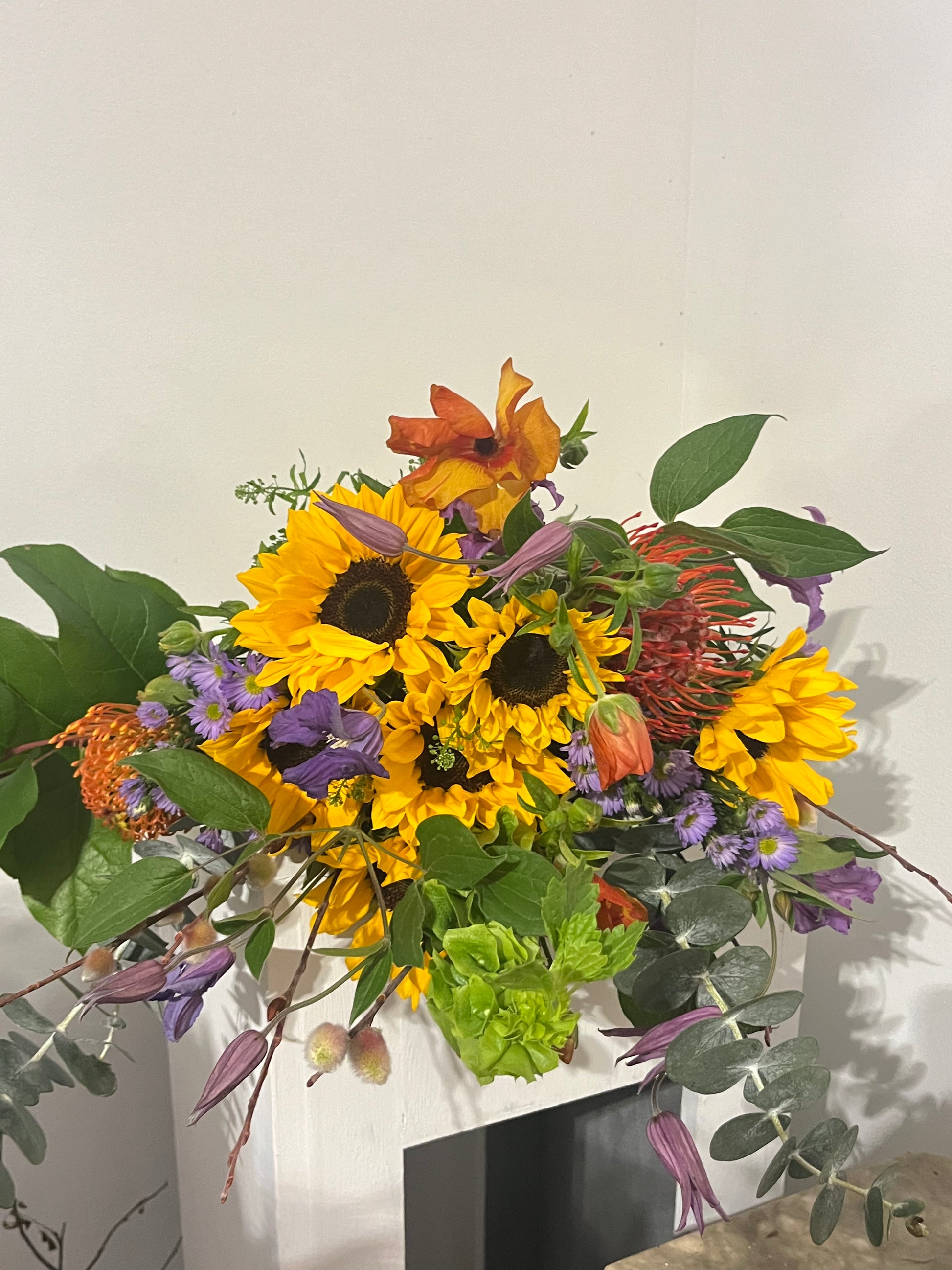 A bold, sun-kissed celebration of love. Golden sunflowers shine alongside striking pincushion protea, delicate clematis, butterfly ranunculus and soft pussy willow for a beautifully wild, textural design.